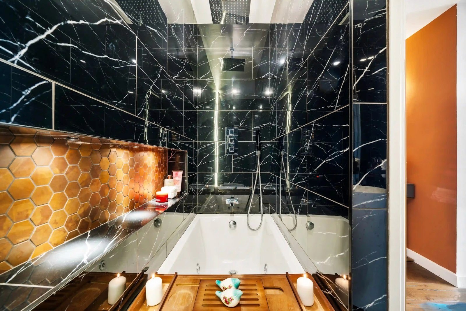 High-end bathtub (freestanding, whirlpool, or stone), premium materials throughout, possible layout changes, and custom features. Often includes heated floors and smart home integration.