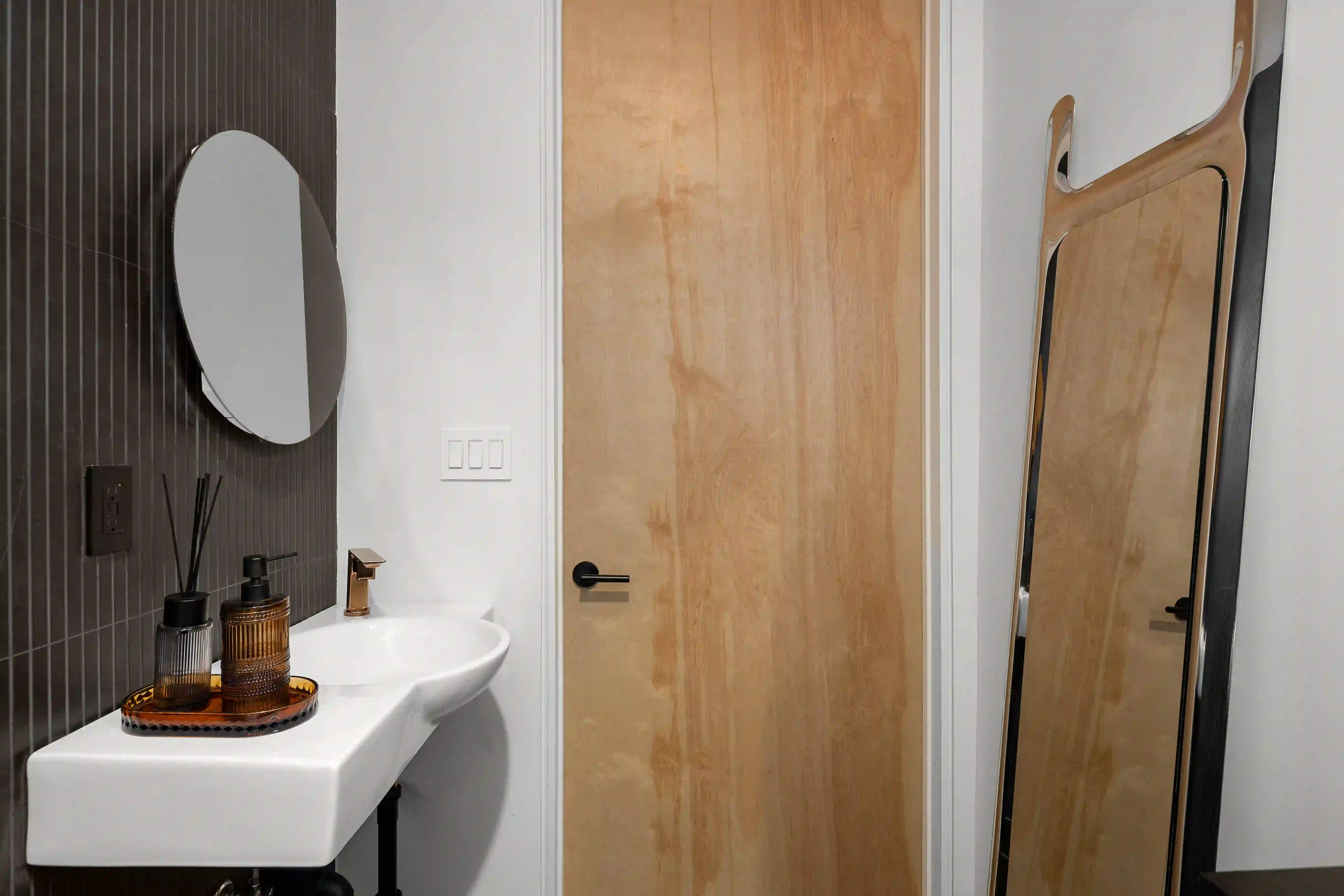 The Powder Room embraces purity of form with a refined material palette and quietly expressive detailing. Vertical dark tile lines create rhythm and height against crisp white surfaces, while a floating basin and soft-edge toilet add sculptural presence. A brushed brass faucet and warm accessories offer just the right touch of contrast, proving that elegance often lives in the subtleties.